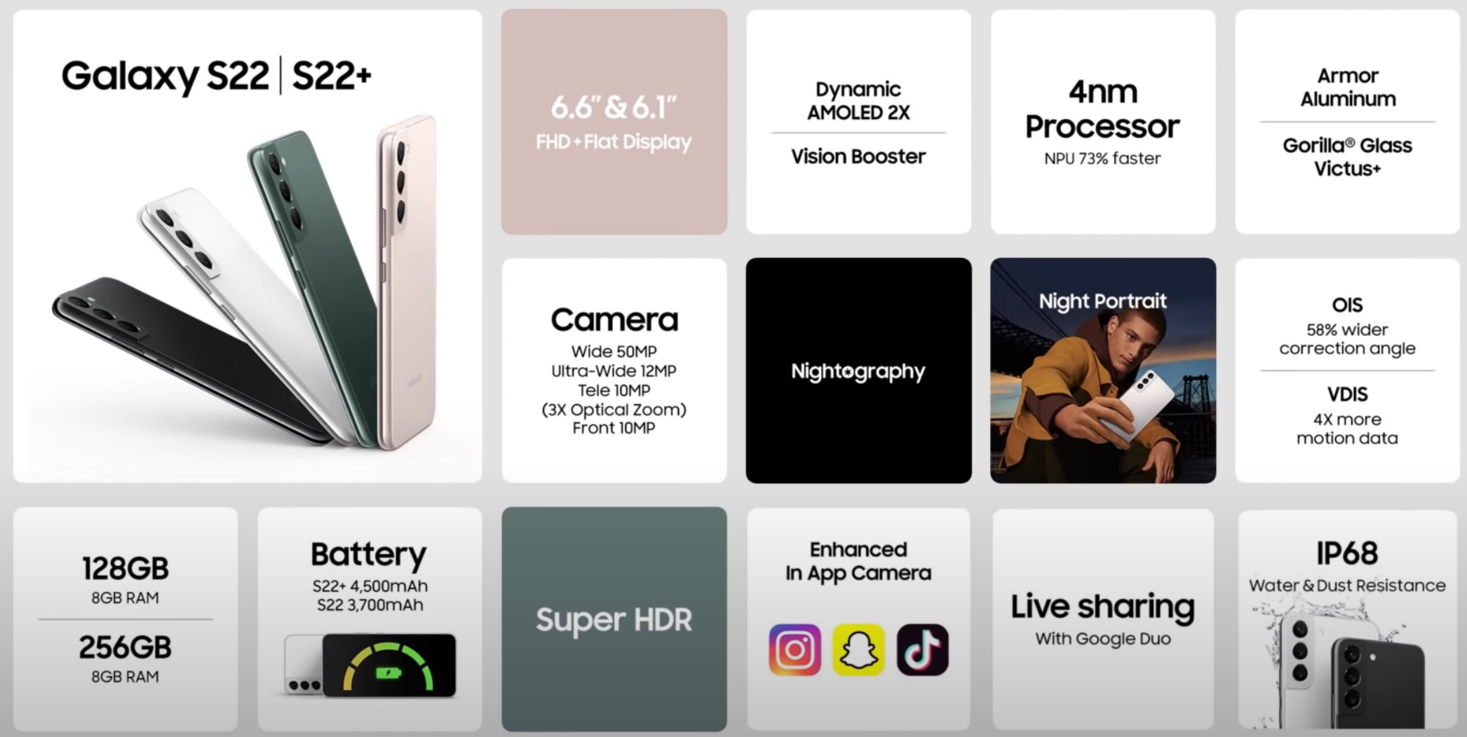 위의 내용은 언팩에서 공개한 S22, S22+의 기능 및 성능을 정리한 타일인데 대략적인 내용을 확인할 수 있다. 물론 밑에 삼성 뉴스룸에서 제공하는 인포그래프와 함께 보면 더 자세히 알 수 있을 것 같다만.