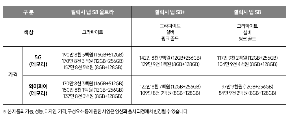 그런데 탭 S8 울트라의 경우 512GB SSD 모델이 존재한다. 이 경우 16GB RAM을 제공한다. 탭 S8, 탭 S8+는 512GB 모델이 없다. 그리고 모든 모델에서 WiFi 지원 모델과 5G 지원 모델이 존재한다. 가격도 당연히 용량 및 통신 지원 모듈에 따라 다르다. 탭 S8 시리즈의 경우 microSD 슬롯을 지원해서 기본 제공 용량에 추가로 최대 1TB까지 추가할 수 있다.
