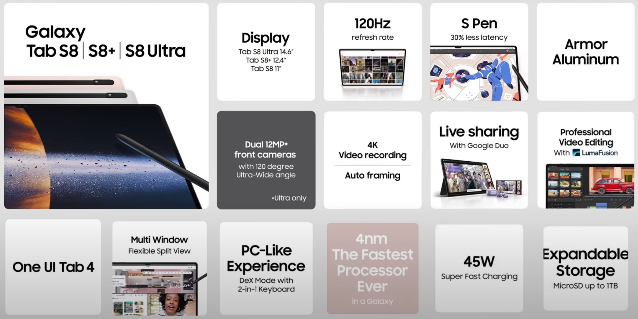 이번 언팩에서 공개된 갤럭시 탭 S8 시리즈는 갤럭시 S22 시리즈와 마찬가지로 탭 S8, 탭 S8+, 탭 S8 울트라의 3가지로 나왔는데 밑에 성능을 정리한 타일이나 인포그래프를 보면 알 수 있듯 기능과 성능은 동일하고 디스플레이 크기와 배터리 용량, 색상 정도만 다르게 나왔다.