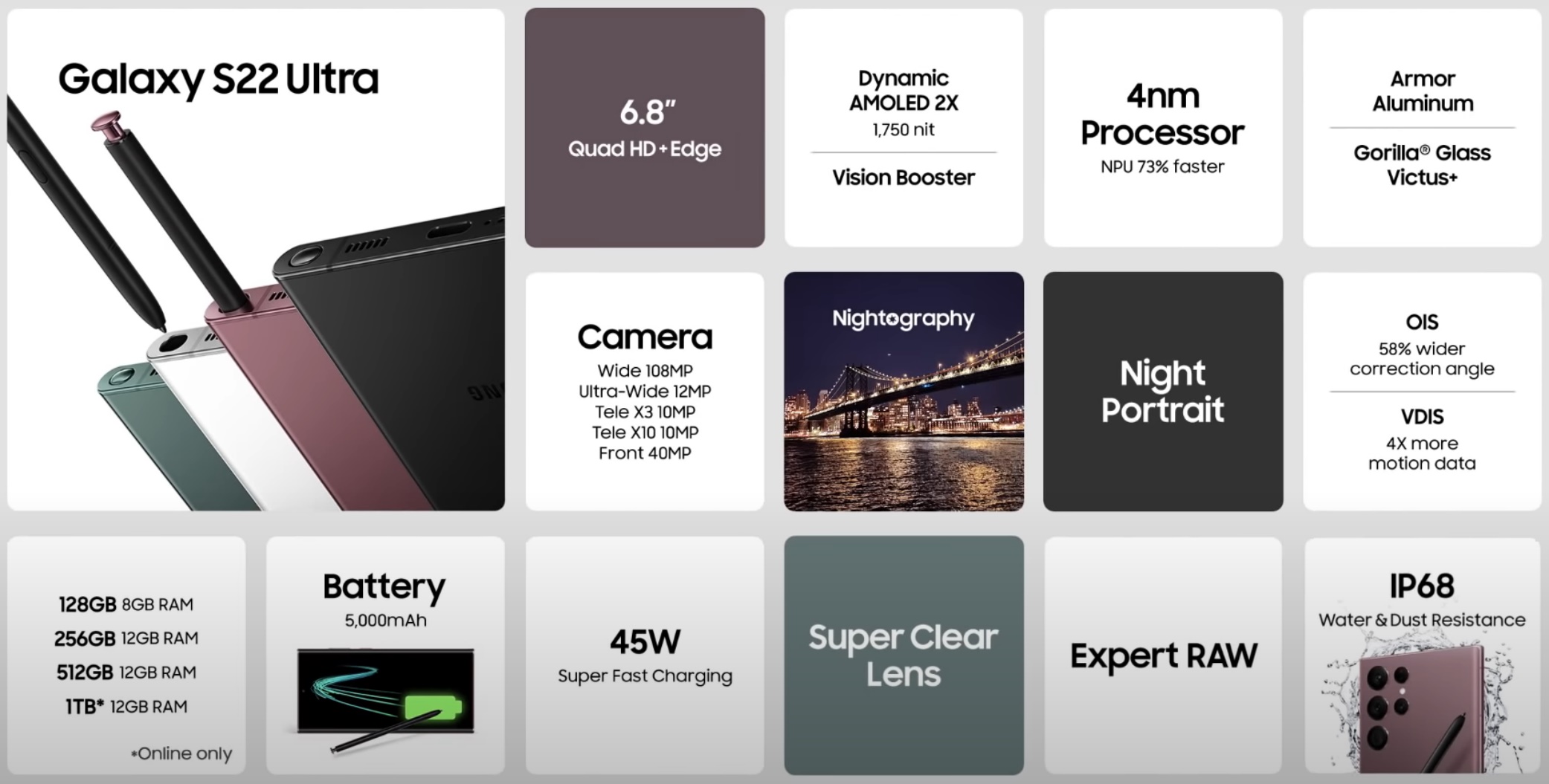얼추 정리를 해봤는데 제품으로 나온 갤럭시 S22 시리즈와 갤럭시 탭 S8 시리즈 중에서는 아무래도 울트라 제품들에 몰빵한 것이 눈에 너무 뻔히 보였다.