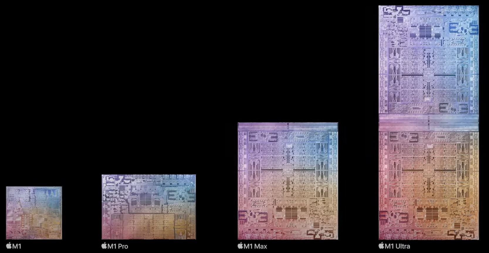 M1 칩셋 시리즈의 크기를 위의 사진에서 보면서 비교하면 M1 울트라가 어떤 녀석인지 알 수 있다. M1에서 M1 프로, M1 맥스로 갈 때 보통 내부의 트렌지스터 숫자, CPU, GPU 코어 숫자 등을 늘려서 확장했는데 M1 울트라는 M1 맥스 2개를 나란히 붙인 것임을 알 수 있다. 물론 마더보드 상에서의 연결이 아니라 칩셋 자체의 연결이다.