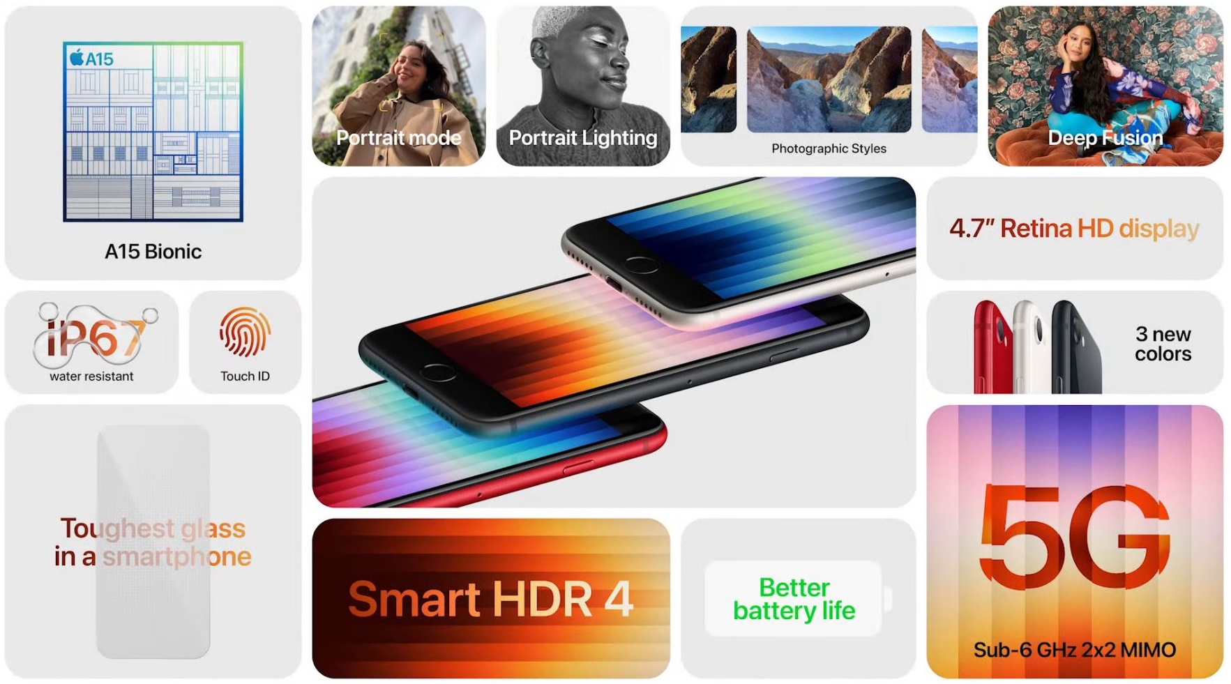 지속적으로 나온 루머에 아이폰 SE 2세대의 후속 모델인 아이폰 SE 3세대(이하 SE3)가 나올 것이라고 했는데 예상대로 SE3가 공개되었다. 디자인은 기존 모델과 동일하며 다른 것은 프로세서, 그리고 배터리 시간 정도다.