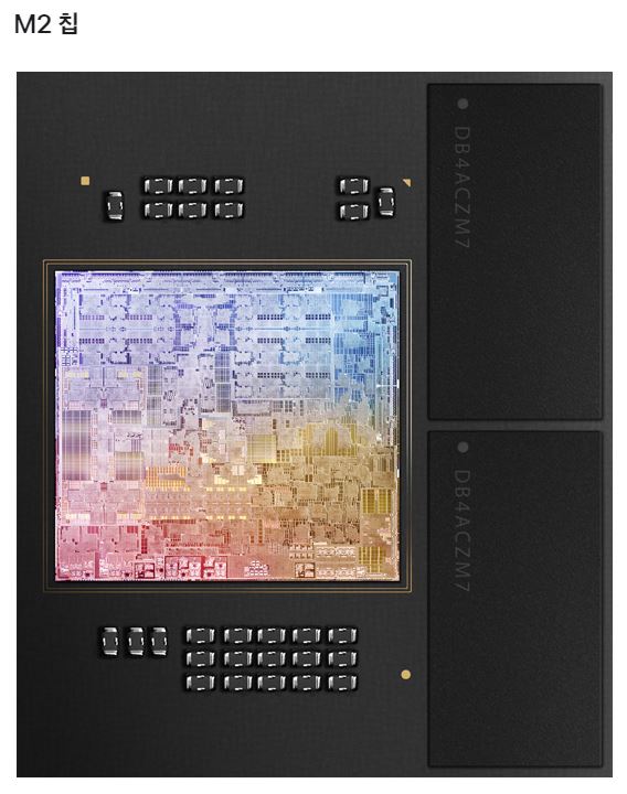 M 시리즈 칩셋은 기본적으로 CPU, GPU에 메모리까지 통합으로 쓰는 설계로 되어 있다. CPU 코어는 M1이 8개였는데 M2도 8개로 동일하다. 하지만 GPU 코어는 M1이 8개(기본형은 7개였음)인데 M2는 2개 더 많은 10개(다행히 M2는 GPU 코어수로 급나누기를 하지 않았다)가 탑재되어 있다.