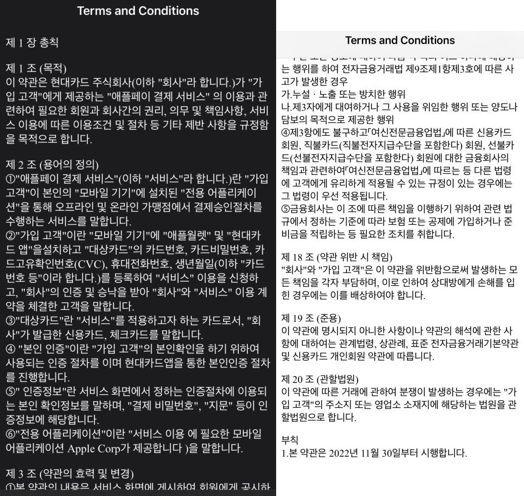 그러는 와중에 거의 애플페이의 현대카드를 통한 국내 도입이 확정되다시피 한 정보가 유출이 되었다. 다름아닌 현대카드의 약관 내용 중 일부가 유출(공개?) 되었는데 거기에 애플페이 관련 내용이 존재했기 때문이다.
