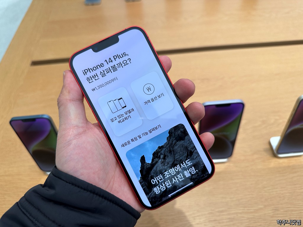 가격도 나름 매리트가 있다. 앞서 언급했던 맥북에어 M2를 비롯해서 밑에서 언급할 대부분의 애플 제품들이 환율로 인해서와 동시에 한국에서의 애플 프리미엄이 붙어서 어마무시한 가격을 자랑하고 있는데 그나마 아이폰14플러스는 기본 모델이 135만원부터 시작하는 나름 착한(?) 가격이다.
