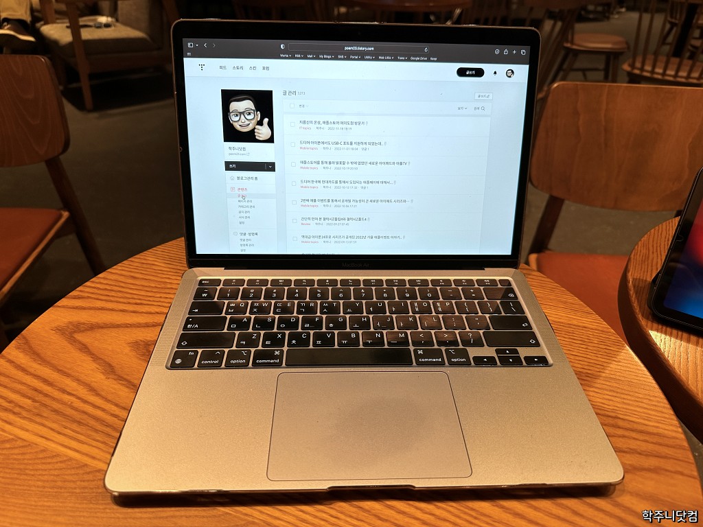 여하튼 앞서 언급한 업무용 말고도 개인용으로 블로깅을 할 때도 맥북에어 M1을 이용한다. 메일을 쓰거나 답변을 보내거나 하는 작업 역시 간단한 내용이라면 아이폰14 프로맥스나 미니6를 이용하지만 분량이 있으면 맥북에어 M1을 쓸 수 밖에 없다.