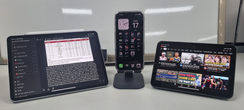 밑에서 상세하기 적기는 하겠지만 아이폰15프로맥스는 뭐 메인 스마트폰이니만큼 개인적으로, 업무적으로 전화, 메시징, 이메일 확인 용도로 많이 사용한다. 아이패드 프로는 업무용으로 세팅했으며 아이패드 미니는 철저하게 엔터테인먼트용으로 세팅해서 쓰고 있는 중이다.