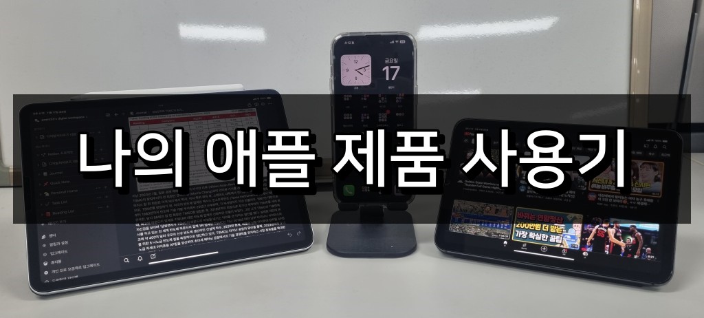 위의 사진을 보면 알 수 있듯 거의 매일 들고 다니다시피 하는 제품들인데 왼쪽으로 아이패드 프로 11인치 1세대(-.-), 그리고 가운데가 아이폰15프로맥스, 오른쪽이 아이패드 미니 6세대다.