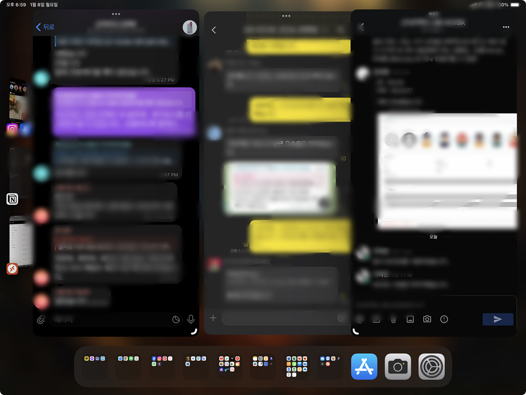 위의 사진은 업무적으로 사용하는 메신저들을 동시에 띄우고 쓰는 모습인데 회사 메신저와 텔레그램, 그리고 카카오톡을 업무용으로 사용하고 있다. 그리고 스테이지메니저를 이용하니까 저렇게 3개를 동시에 띄우고 작업하는 것이 가능해서 효율적으로 쓰고 있는 중이다.