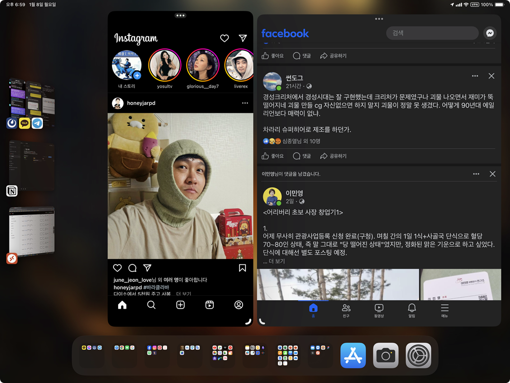 페이스북은 그렇다고 쳐도 인스타그램의 경우 아이패드에서도 아이폰용 UI로 보여주기 때문에 좀 불편하기는 했는데 스테이지매니저를 통해서 크기를 모바일용으로 맞춰놓고 사용하니 꽤 괜찮은 듯 싶다.