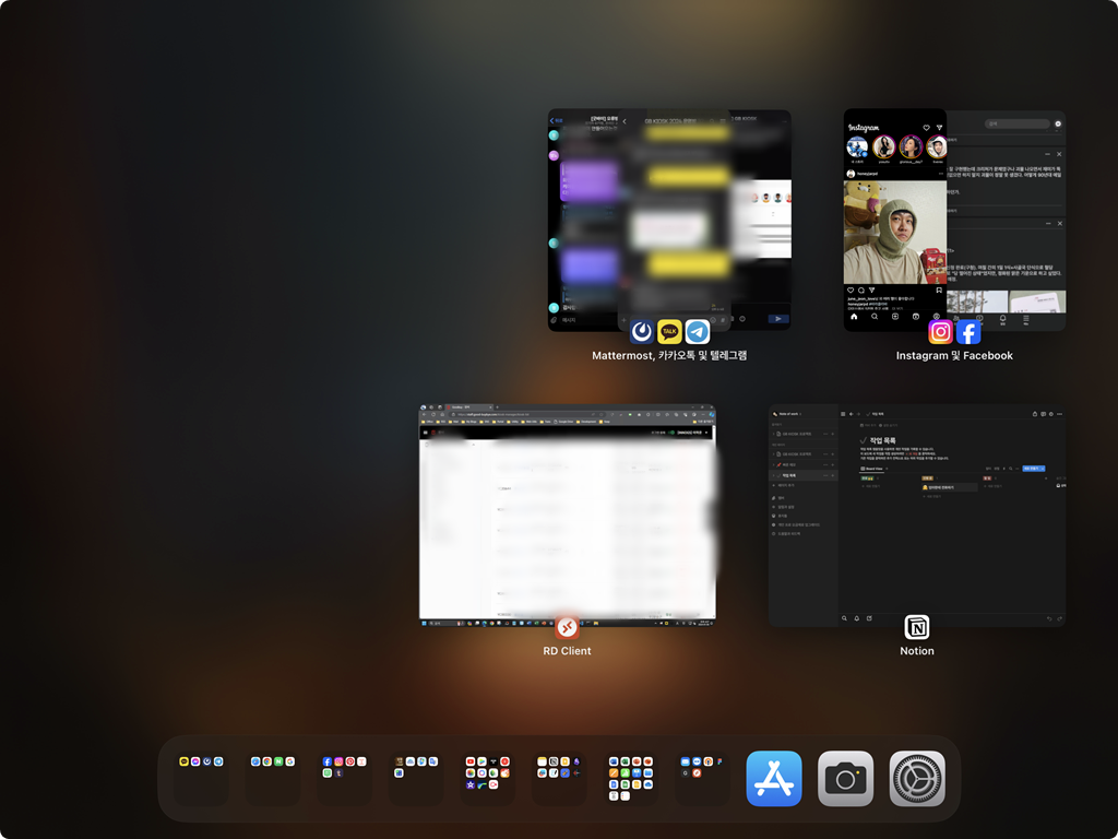 그리고 유튜브나 웹브라우저의 경우 스테이지매니저를 사용한다고 하더라도 창 크기를 최대로 키워서 풀스크린으로 사용한다. 위의 노션도 그렇고 원격 데스크탑 앱도 풀스크린으로 사용한다. 스테이지메니저를 쓰게 되면 창 크기가 좀 작아지는데 전체 화면으로 보는 것이 더 좋기 때문에 말이다.