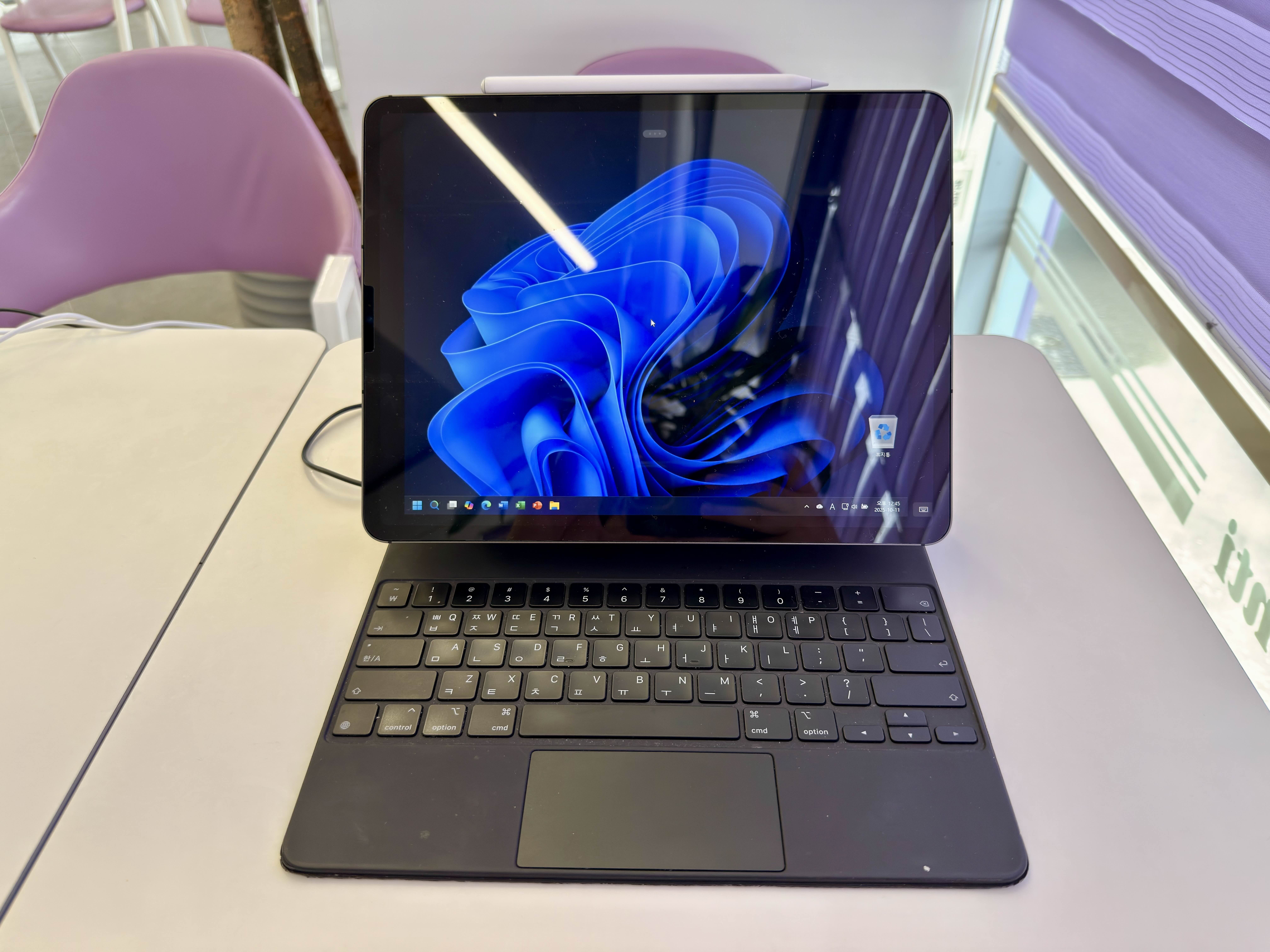 다만 블투 키보드와 마우스를 따로 갖고 다녀야 하는 불편함이 있고 매직키보드의 경우 매직키보드 자체에서 충전을 위한 USB-C 포트를 제공하는데 위와 같이 하면 아이패드에서 제공하는 USB-C 포트 1개밖에 사용할 수 없어서 별도로 허브를 갖고 다녀야 하는 불편함이 있다.