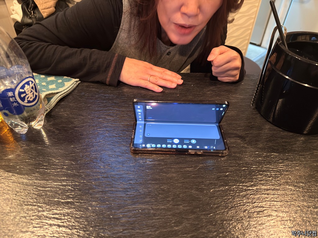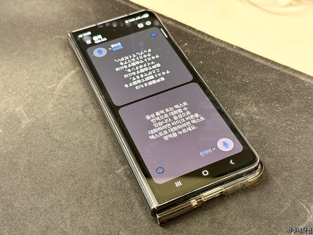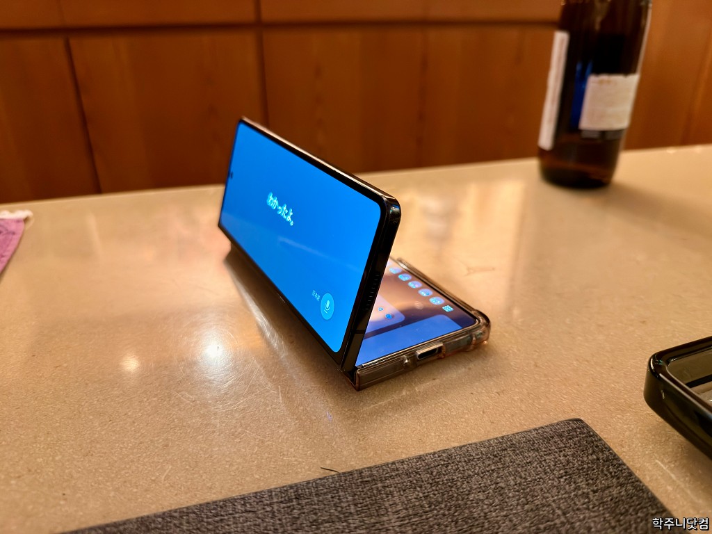 위의 사진은 처음에 저렇게 놓고 대화를 진행할 때 상대방이 신기해하면서 마이크에 가깝게 대고 말하기 위해서 저렇게 했다. 그런데 갤럭시Z폴드5의 마이크 수음 성능이 좋기 때문에 어느정도 거리가 있어도 충분히 음성 인식이 가능하다. 뭐 저렇게 수그리고 얘기하기도 하고 또 들어서 얘기하도 했는데 나중에는 그냥 탁자에 두고 얘기를 했는데도 잘 되었다.