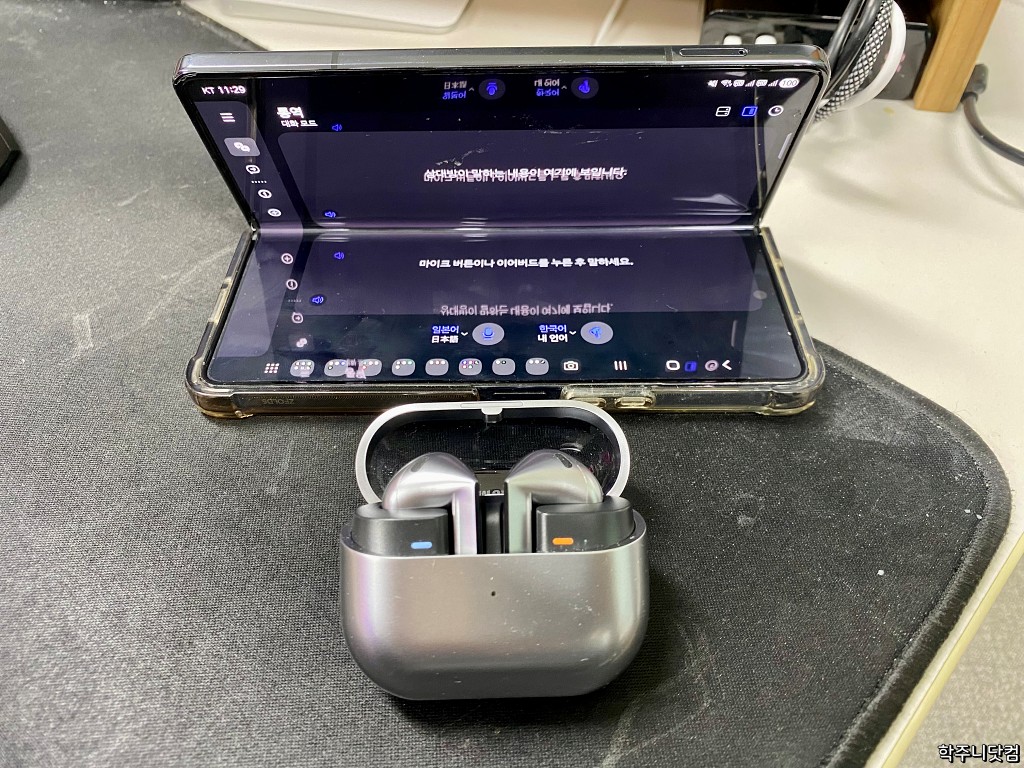 나는 갤럭시 버즈3를 낀 상태로 대화를 진행하게 된다. 접힌 메인 디스플레이에 보면 접힌 쪽 위에는 내가 말하는 내용의 번역된 내용이, 아래에는 음성 인식으로 내가 말하는 내용을 보여준다. 물론 이것도 밑에 보면 마이크 버튼이 보이는데 커버 디스플레이와 달리 2개가 보이는데 하나는 상대방이 말할 때 쓰는 마이크, 그리고 내가 말할 때 쓰는 마이크 버튼이다.